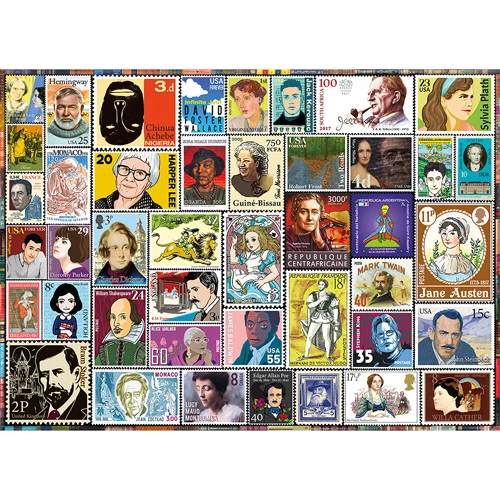 This jigsaw puzzle for adults and kids features a collage of stamps of famous authors. This literary jigsaw puzzle has bright colors and a wonderful artistic design. Feel inspired by the vintage artwork and notable authors like Austen, Poe, Baldwin, and more!