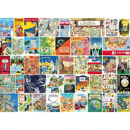 From maps to motels, this collage-style puzzle is a nostalgic tribute to all things travel. This 1000-piece puzzle comes in a deluxe box with a mini poster.