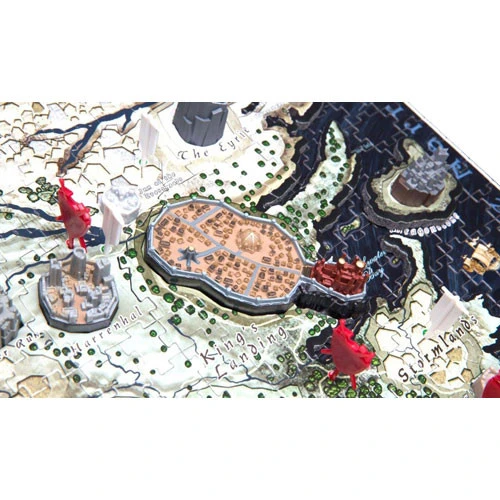 This puzzle will guide players through the assembly of the map of Westeros in a patented multi-layer design. The first layer is a 1000+ pieces jigsaw puzzle that will teach you all about the various locations and regions of Westeros. The second layer is an artistic 200+ pieces jigsaw puzzle that replicates the current landscape based on the famous introduction of the television series. The third layer adds the 3D miniature replicas models that you insert into the puzzle, which include famous cities and castles such as Kings Landing, Winterfell, Eyrie, the Wall, and more!
