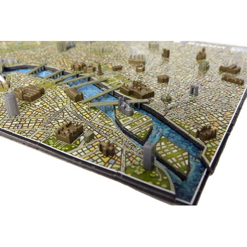 The base of the puzzle is a traditional 2D jigsaw puzzle composed of 1000+ pieces that forms the city’s street layout and islands. During the process of constructing the base map, one learns about Paris’ neighborhoods, streets, museums, and more. Once the puzzle base is complete, the vertical building of Paris begins by placing 75 buildings and skyscrapers in chronological sequence. This is done by following the enclosed Time Poster, which also details the history of each building.