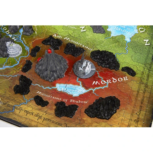 This puzzle will guide players through the assembly of the official The Lord of the Rings Middle-earth map in a patented multi-layer design. The first layer is a 1000+ piece jigsaw puzzle that will teach you all about the various locations and regions of Middle-earth. The second layer is an artistic 200+ pieces jigsaw puzzle that replicates the colorful landscape. The third layer you insert 3D miniature replicas models into the puzzle, which include famous buildings and structures such as Barad-dûr, Mount Doom, Minas Tirith, Isengard and many more! Each model is a highly detailed sculpt piece of the actual location.