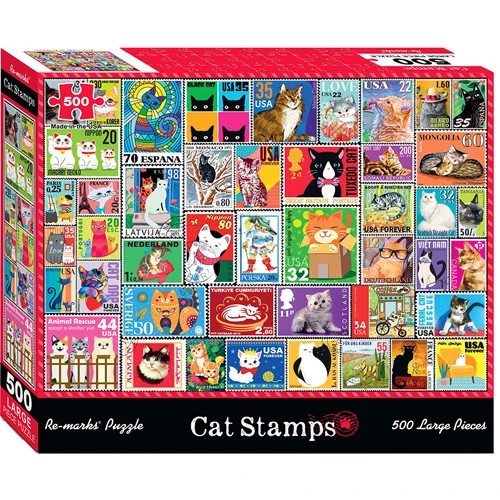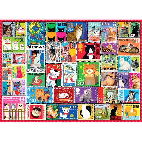 Cat people, this puzzle is for you! Featuring colorful cat-themed stamps in an easy to assemble collage-format, this 500-piece puzzle is a great gift for cat lovers of all ages. Larger pieces are great for those who prefer an easier puzzling process – from kids to seniors. This 500-piece puzzle comes in a deluxe box with a mini poster.