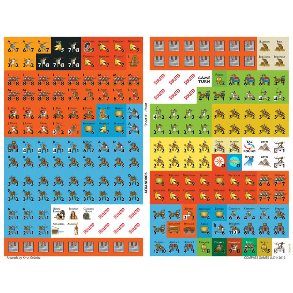 On the main “strategic” area map, one inch equals 80 miles and one game turn represents three months of calendar time. On the abstract battle display map, distances represent various frontages depending on the size of each individual battle. In large engagements that’s about 3,000 yards, total, and each round of combat represents 15 to 30 minutes. Each unit of manuever represents formation of between 1,000 and 5,000 me. There are three main unit types: heavy infantry, light infantry, and heavy cavalry. Other countries represent individual leaders of note, Persian treasury, the Gordian Knot, the Oracle of Ammon, and Princess Roxana.