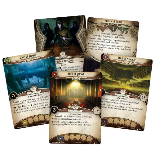 The Lair of Dagon is the fifth Mythos Pack in The Innsmouth Conspiracy cycle. It contains Scenario VII (cards 261-300) of the Innsmouth Conspiracy Campaign.