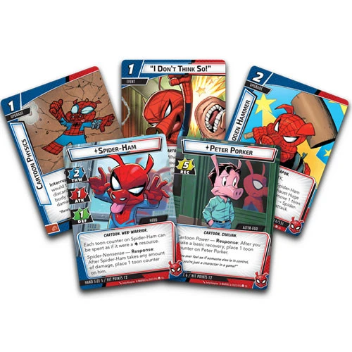 This cartoon wonder WHAMs his way into players’ games of Marvel Champions LCG with zany aplomb. Utilizing his wacky cartoon physics and goofy antics, Spider-Ham can take hits like a champ and thwart villains’ schemes with all sorts of colorful nonsense. With this Hero Pack, players will find Spider-Ham, his fifteen signature cards, and a full assortment of Justice cards inviting them to ruin the villains’ plans. This pack also includes a bonus modular encounter set featuring the iconic and terrifying Inheritors.