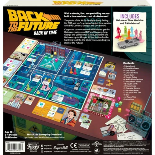 In the fully co-operative game Back to the Future: Back in Time, each player takes on the role of a major character from the movie: Marty McFly, Doc Brown, Jennifer Parker, or Einstein the dog. The objective of the game is to have the characters move around 1955 Hill Valley, collecting certain items in an effort to fix Doc’s famous DeLoreon time machine, defeat Biff Tannen and his gang of trouble-making friends, while ensuring that Marty’s parents fall in love. Only when that is accomplished can players then accelerate the DeLoreon to 88 MPH down Main Street before the clock tower strikes 10:04 pm!