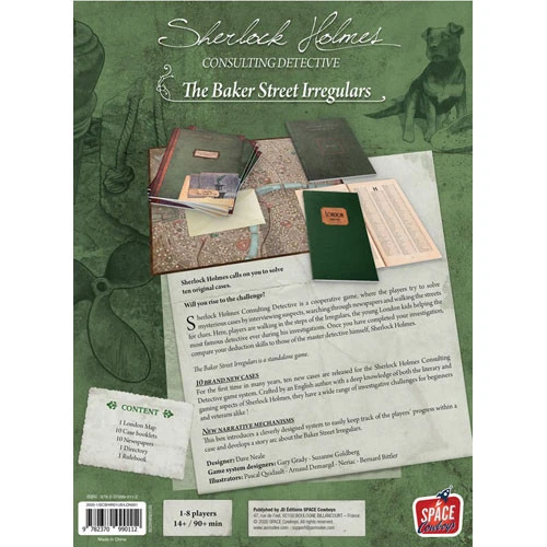 Sherlock Holmes Consulting Detective is a cooperative game, where the players try to solve mysterious cases by interviewing suspects, searching through newspapers, and walking the streets for clues. Here, players are walking in the steps of the Irregulars, the young London kids helping the most famous detective ever during his investigations. Once you have completed your investigation, compare your deduction skills to those of the master detective himself, Sherlock Holmes.