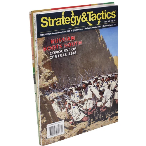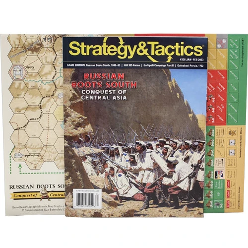 Russian Boots is a two-player wargame simulating the Russian conquest of Central Asia during the 1850s to 1890s. There are two opposing players: Russian Empire and Khanates. The Russian Empire player represents the theater command of an autocratic empire. The Khanate player represents the various independent kingdoms and tribes of the region, with the possibility of intervention from forces on the periphery. Victory conditions are asymmetrical, with the Russians trying to conquer Central Asia and the Khanates trying to prevent this. There are three scenarios, each representing a different situation. Each game turn (GT) represents a from one to six years, depending on the pace of operations. Each hexagon on the map represents 80 to 90 kilometers (53 miles). Each Russian unit represents one or two battalion-sized grouping of companies or squadrons. Other units represent brigade or division-sized units, along with corresponding logistics, as well as groupings of tribesmen or other fighters ranging between 1000 to 5000 fighters. Generals represent key commanders, their staffs, and an elite guard.